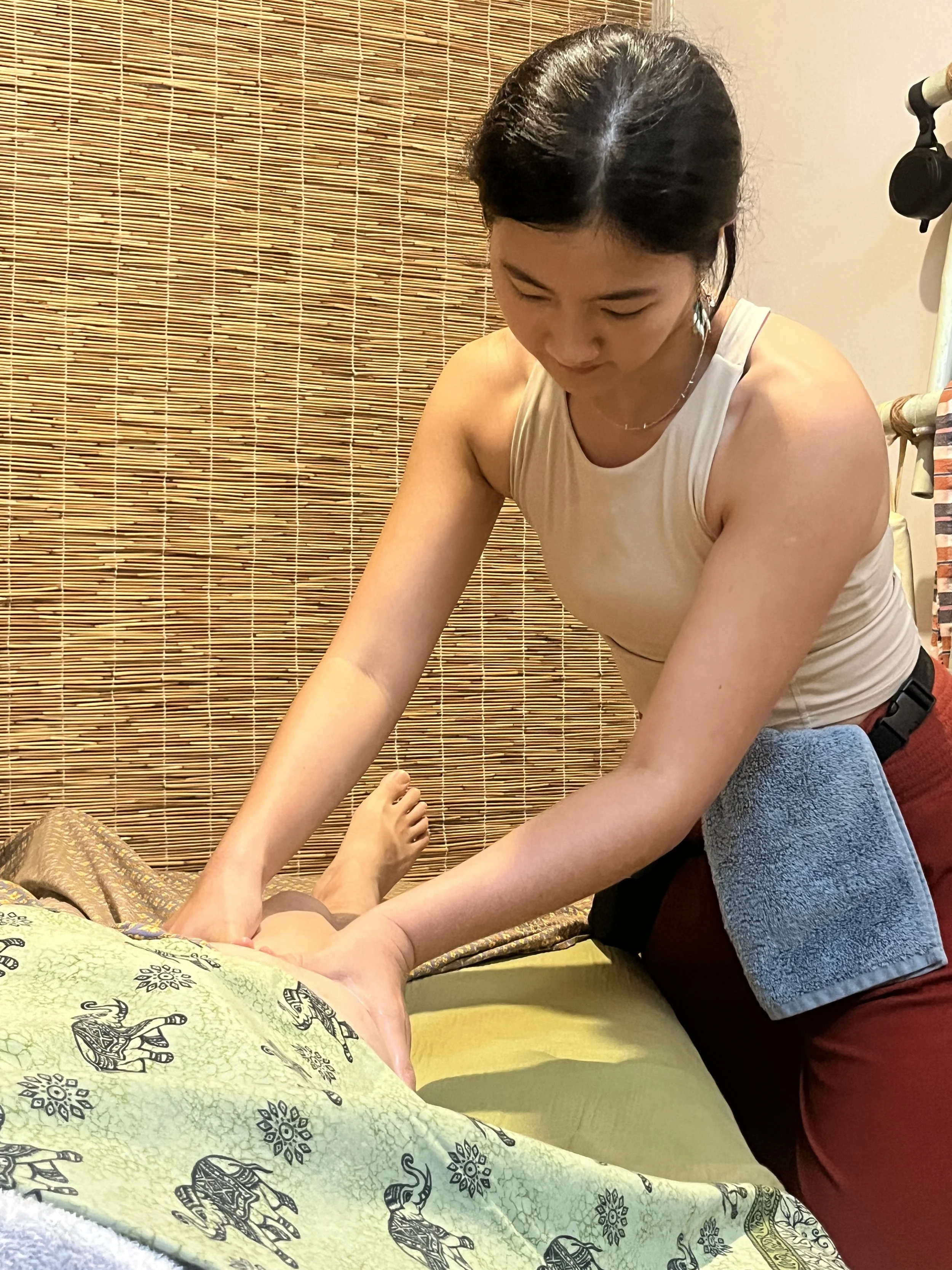 Como trabajadora corporal y danza movimiento terapeuta en formación, integro la base del masaje tailandés y chino con una escucha profunda del cuerpo.